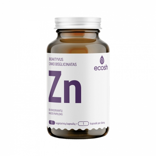 „Ecosh“ maisto papildo sudėtyje – cinko bisglicinatas. Cinkas padeda: palaikyti normalią imuninės sistemos veiklą, normalią kaulų, plaukų, nagų ir odos būklę; apsaugoti ląsteles nuo oksidacinės pažaidos, išsaugoti normalų regėjimą; palaikyti normalią vitamino A apykaitą bei normalią rūgštinę-bazinę apykaitą; palaikyti normalų vaisingumą ir reprodukciją; palaikyti normalią testosterono koncentraciją kraujyje. „Ecosh“ – Estijos maisto papildų gamintojas, siekiantis gaminti kuo natūralesnius, kokybiškus ir efektyvius maisto papildus. Naudojamos vegetarinės kapsulės (be kietiklių, dažiklių ir kt.), maisto papildai yra be konservantų, dauguma tinkami vegetarams. Produkto kiekis: grynasis kiekis – 60 g, 90 vegetarinių kapsulių, 500 mg kapsulė.
