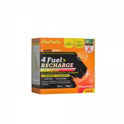 Novatoriškas papildas, kurio pagrindas yra kalis, magnis, kreatinas ir glutaminas. Subalansuota formulė geriausiai tinka norint atstatyti organizmą po treniruotės. Idealiai tinka nuovargio, raumenų silpnumo, mėšlungio, gausaus prakaitavimo atvejais. ATSISTATYMAS – ORGANIZMO BALANSAS – SVEIKATINGUMAS – IŠTVERMĖ SU KREATINU IR „AJIPURE AMINAIS“ Unikali subalansuota „4FUEL RECHARGE“ maisto papildo formulė. „4FUEL RECHARGE“ gali būti vartojamas prieš, per ir po fizinio krūvio. Geriausia jį vartoti po fizinio krūvio, prisidedant prie organizmo atsistatymo. Maksimaliam vartotojų patogumui gamintojas siūlo itin patogias produkto pakuotes, leidžiančias patogiai pasiruošti treniruotei, nesvarbu, ar ji buvo planuota, ar ne, esate savo kasdieninėje rutinoje ar kelionėje. Paruošti paketėliai neužima vietos, ir sporto papildas gali būti paruoštas per kelias sekundes. Visada šviežias, nes pakuotė atidaroma tik prieš vartojimą. Kiekviename paketėlyje yra subalansuota efektyvi, profesionaliems sportininkams skirta formulė. „4FUEL RECHARGE“ maisto papilde yra kalio, magnio, kreatino ir glutamino. Italijos gamintojo „Namedsport S.r.l.“ produktai gaminami naudojant tik premium kokybės standartais laikomas žaliavas: Ajinomoto, Kyowa, Creapure, Carnipure, IFOS, Carbelac, Izolac ir kt. Profesionalių elitinių atletų įvertinta kokybė ir pasitikėjimas. Grynasis kiekis: 14 paketėlių x 8,5 g = 119 g.