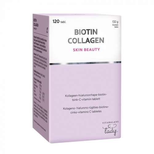 Kolageno, hialurono rūgšties, biotino, cinko ir vitamino C tabletės. Maisto papildo „Biotin Collagen“ sudėtyje yra kliniškai patikrinto „Verisol P“ kolageno. Jungiamajame odos audinyje esantis kolagenas palaiko odos stangrumą. Kolagenas sudaro apie 80 % sausos odos masės. Nuo 30 metų kolageno susidarymas odoje natūraliai pradeda mažėti apie 1–2 % per metus. Šis mažėjimas ypač sustiprėja po menopauzės. Odos senėjimo požymiai – tai odos stangrumo ir elastingumo praradimas bei raukšlės. Biotinas padeda palaikyti normalią odos būklę. Cinkas padeda palaikyti normalią odos būklę. Vitaminas C prisideda prie normalios kolageno sintezės normaliai odos funkcijai palaikyti. Rūpinkitės savo grožiu iš vidaus! „Biotin Collagen“ sudėtyje esantis „Verisol P“ kolagenas yra kiaulinės kilmės, todėl jį gali vartoti žuvų produktams alergiški žmonės.