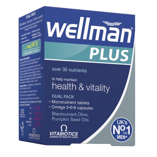 Dviguba pakuotė vyrams. Visos „Wellman Original“ teikiamos naudos su ypatingo grynumo omega 3-6-9 kapsule. Grynasis kiekis: 42 g. Aminorūgščių, vitaminų ir mineralų kompleksas vyrams, papildytas omega 3-6-9 riebiosiomis rūgštimis. Geležis, vitaminai B6, B12 padeda palaikyti normalią energijos apykaitą. Selenas ir cinkas padeda palaikyti normalią imuninės sistemos veiklą. Cinkas padeda palaikyti normalią testosterono koncentraciją kraujyje. Selenas padeda palaikyti normalią spermatogenezę. Omega riebiųjų rūgščių kapsulės sudėtis specialiai subalansuota pagal vyro organizmo poreikius: omega 3: iš ypač aukštos kokybės žuvų taukų; omega 6: iš juodųjų serbentų sėklų ir moliūgų sėklų aliejų; omega 9: iš farmacinės kokybės alyvų aliejaus. Viskas, ko reikia įvairaus amžiaus vyrų energijai ir gerai savijautai, – vienoje pakuotėje!